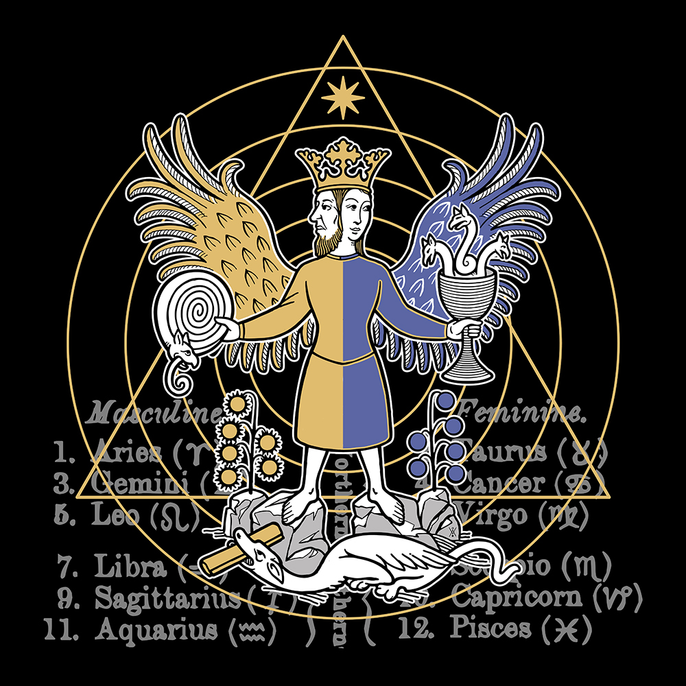 This is an alchemical symbol redesigned from an ancient manuscript (1400 AD). It first appeared in Rosarium Philosophorum in 1240 AD. In a few words it represents the masculine and feminine influence on the path of knowledge. I added the zodiac masculine and feminine signs. For more informations about its story: HERE