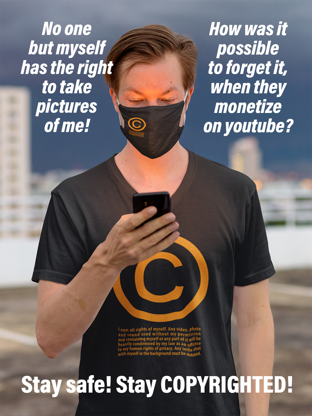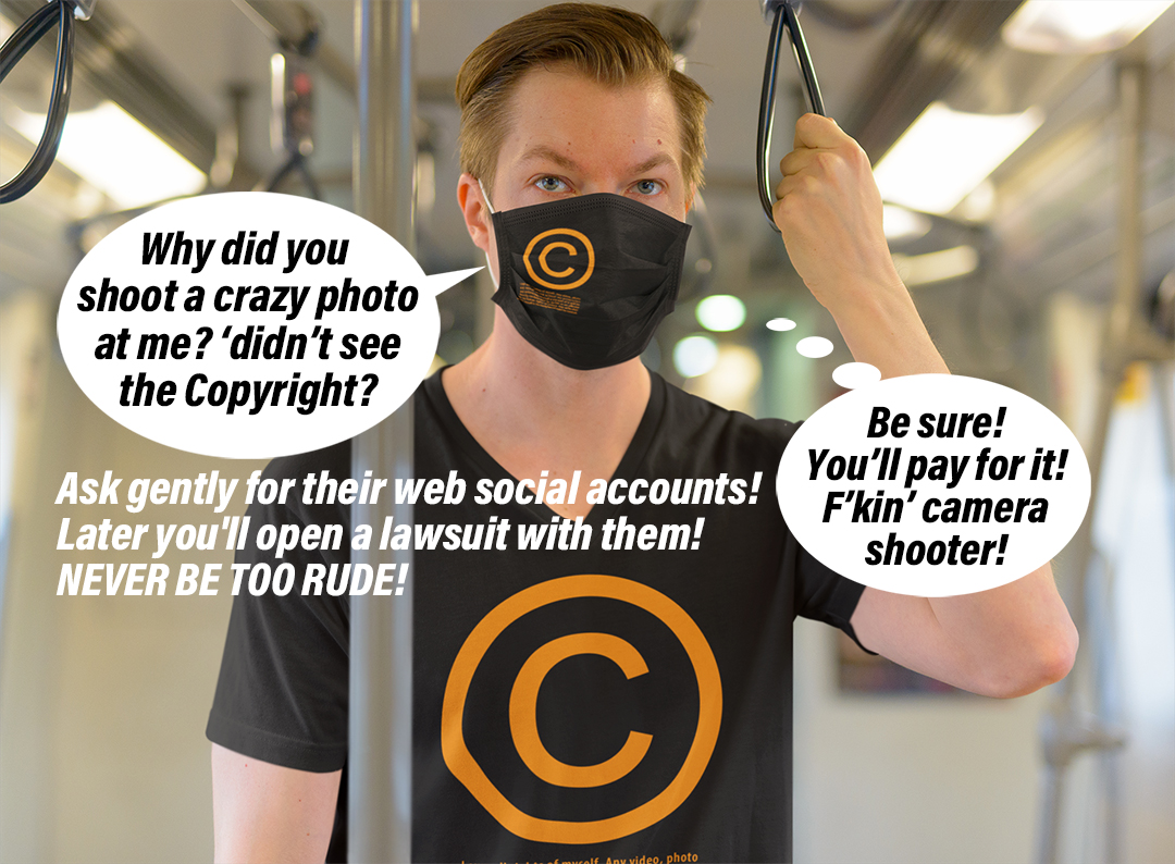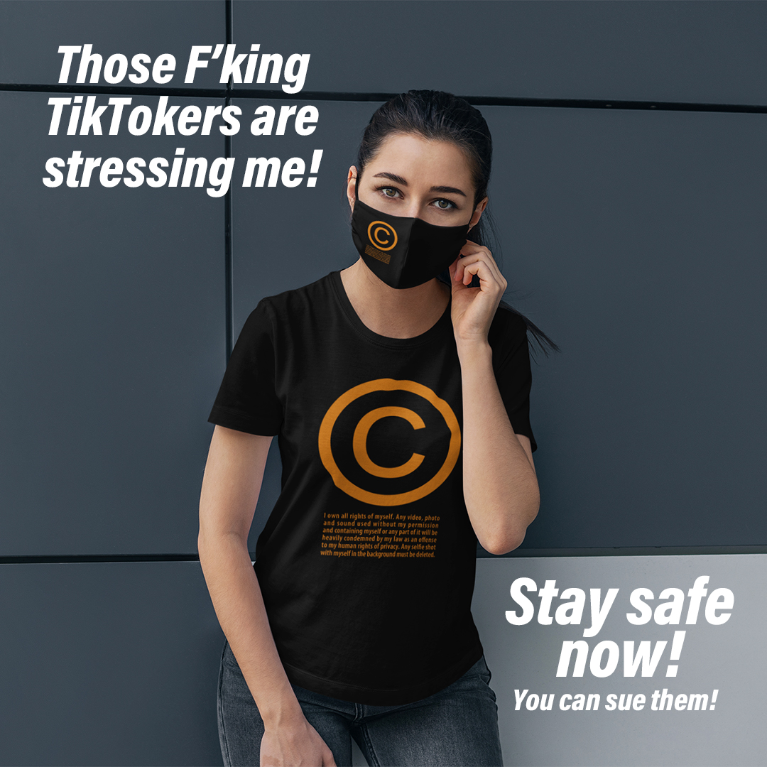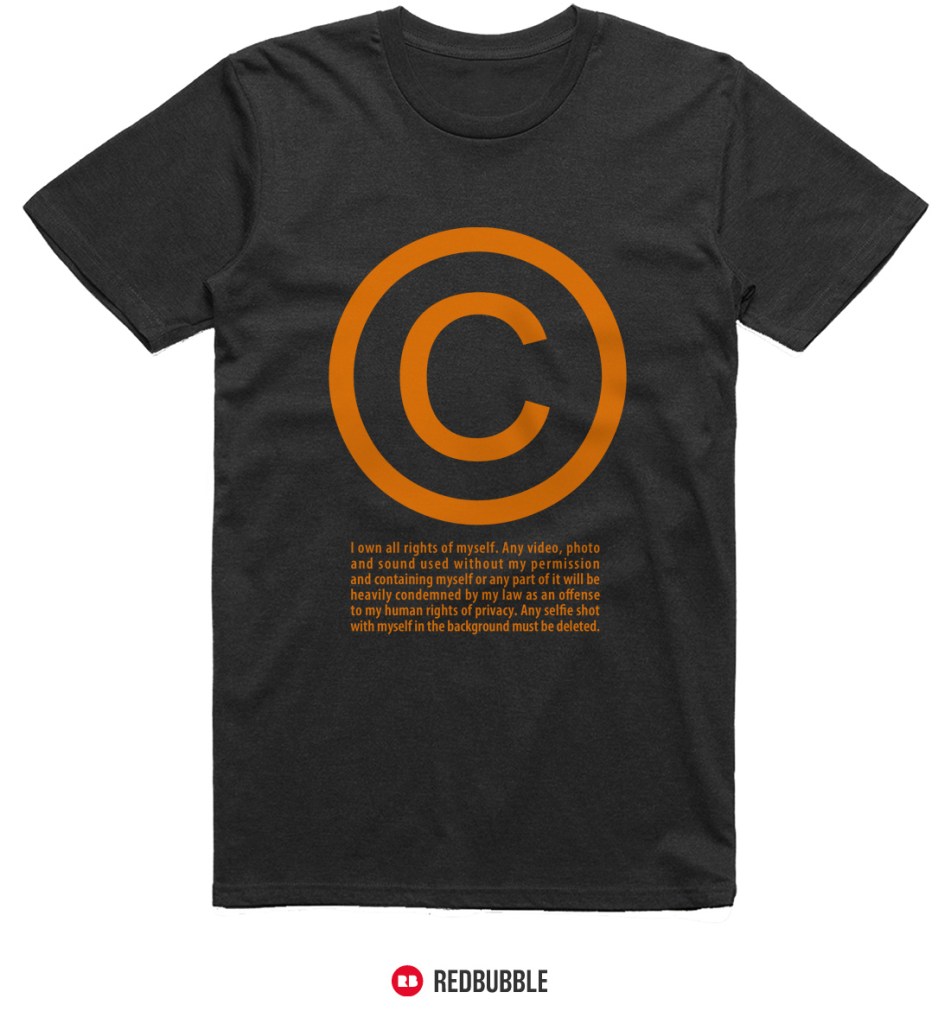 For more INFOS about privacy, photos and public recordings you can read this LINK, but remember: if you’ve got a VISIBLE © on your T-shirt, it clearly means that you don’t want to be filmed or photographed! Not for free and not for trivial reasons! (those trivial reasons are monetized on youtube). A © T-shirt is an idea to claim individual freedom in this world of webcams: a symbol.